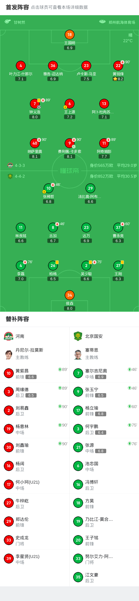河南2-0国安,钟义浩百场破门,卡多索点射建功,张玉宁中柱